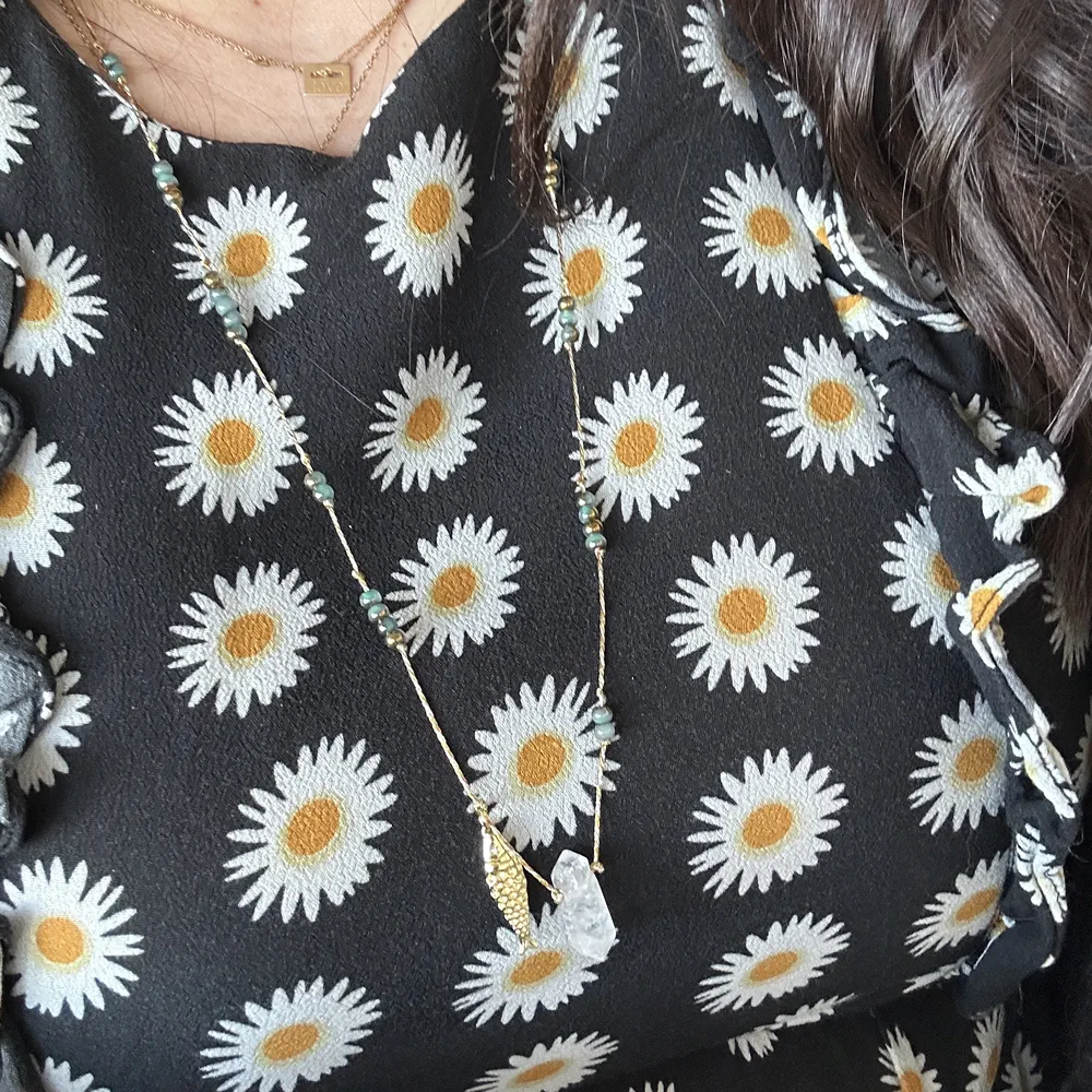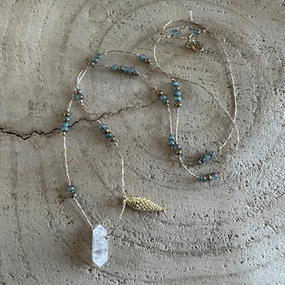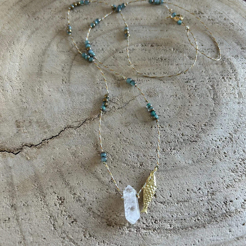 Craquez pour un collier qui booste votre mental et votre journée avec son cristal de roche, ses jolies perles de rocaille et son pendentif poisson doré.