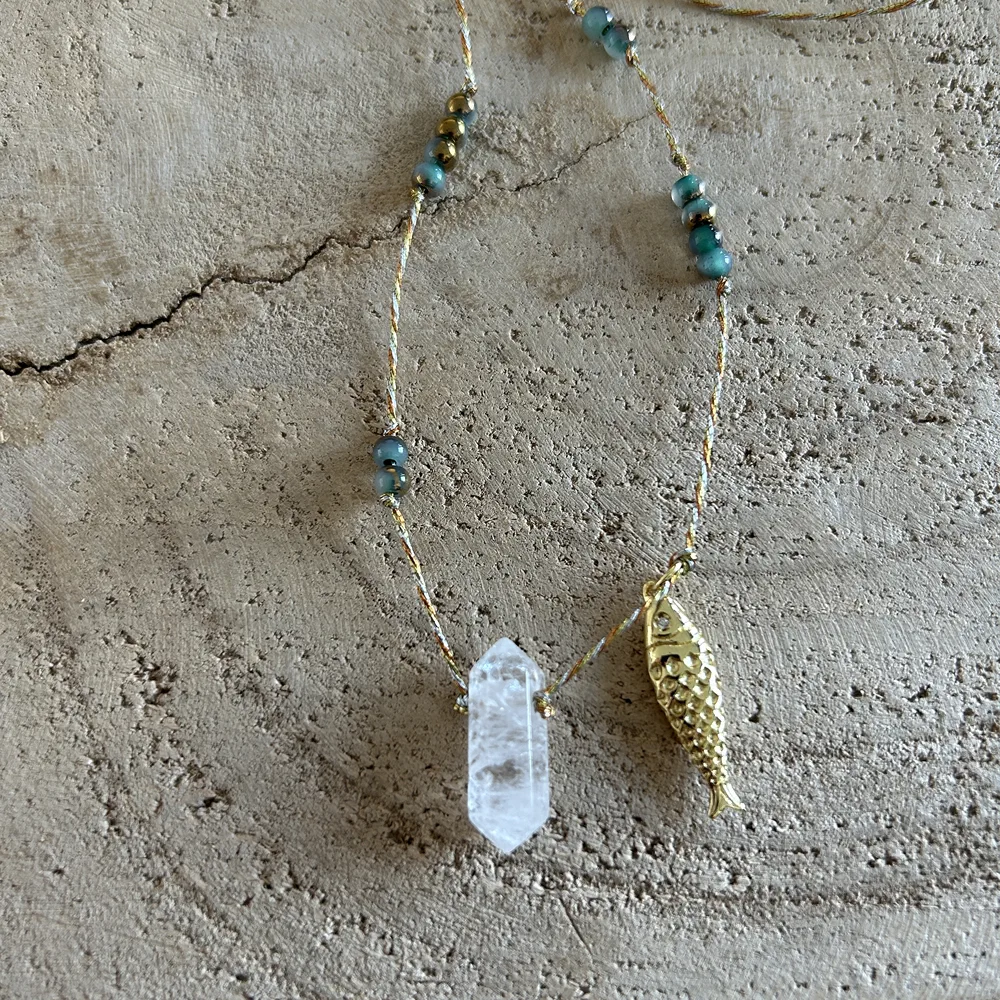 Collier en pierre naturelle Cristal de roche, grigri poisson et perles de rocaille