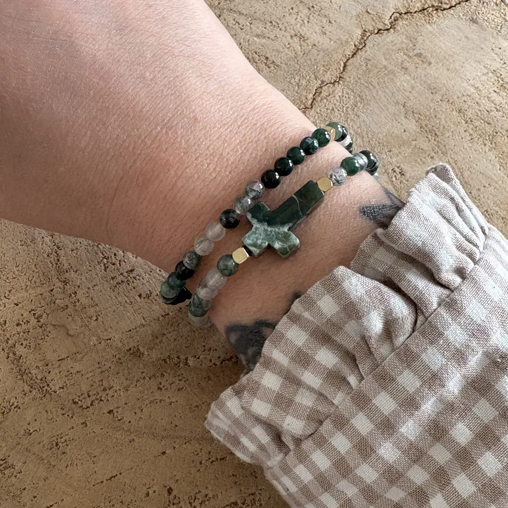 Bracelet double en Agate Mousse & croix en Agate Indienne