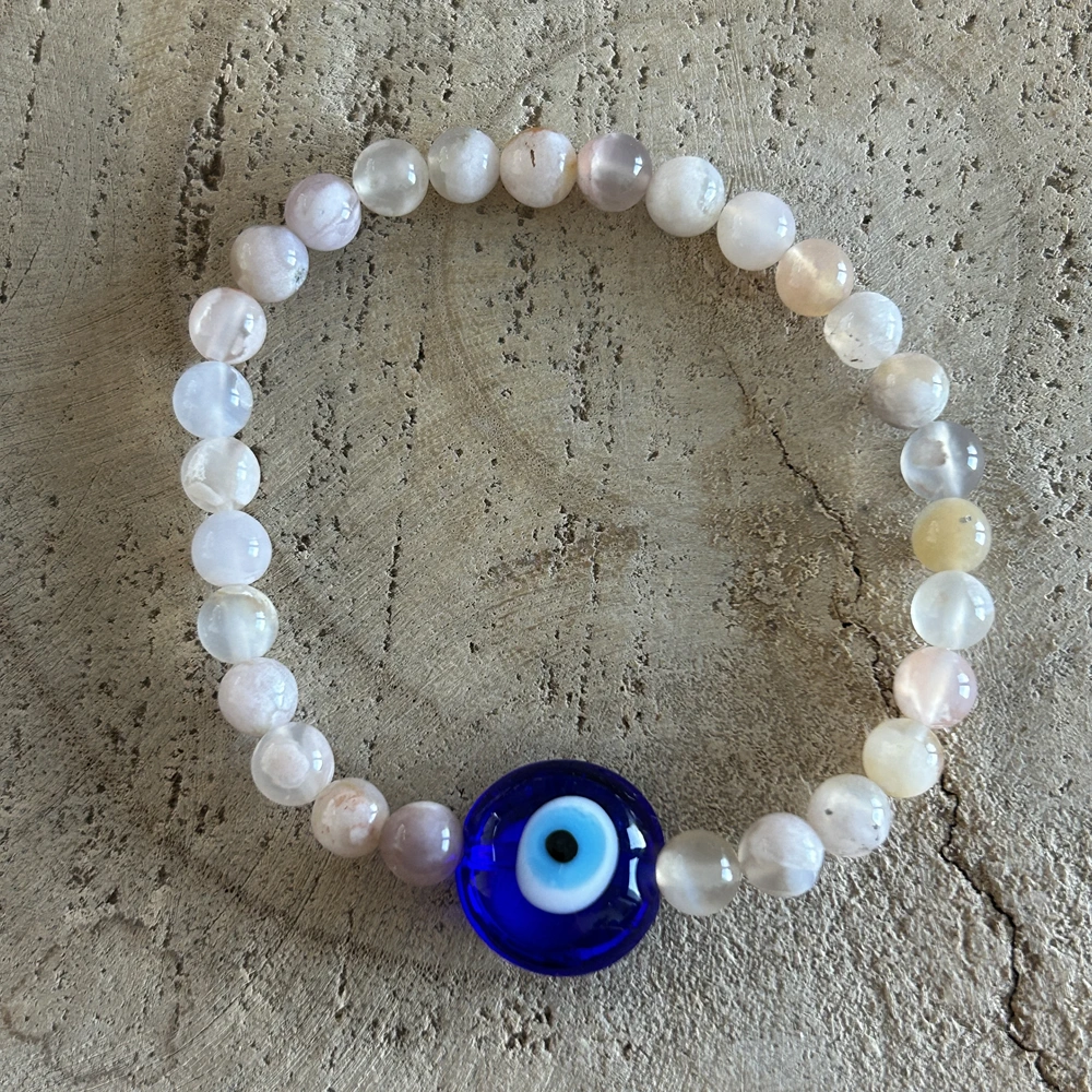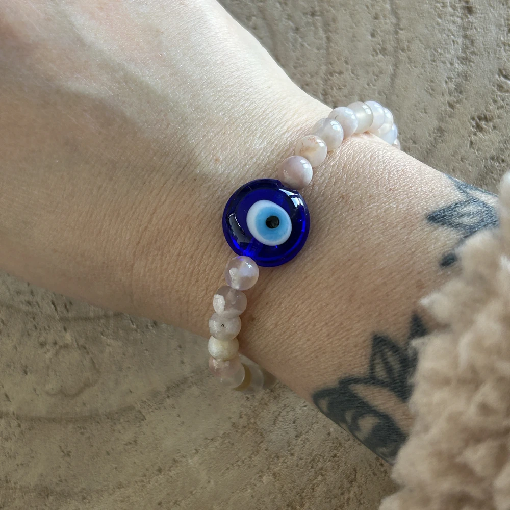 Bracelet en pierre naturelle, Agate fleur de cerisier, oeil de nazar