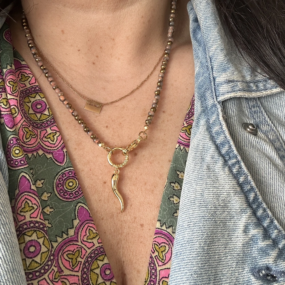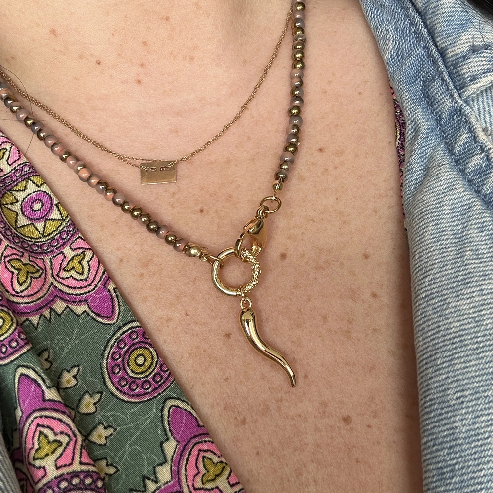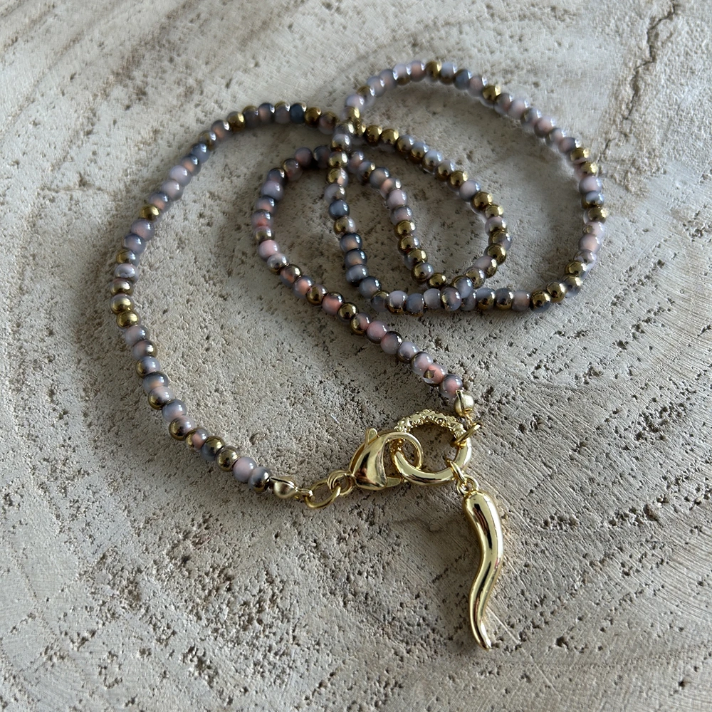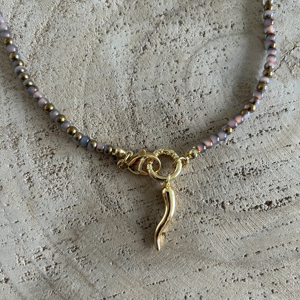 Un collier choker en perles de rocaille marrons avec une corne d’abondance doré (piment italien) réputé pour être un porte bonheur.