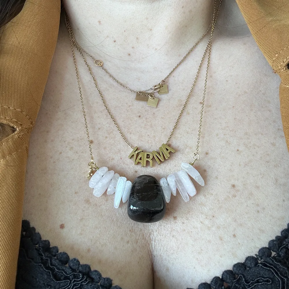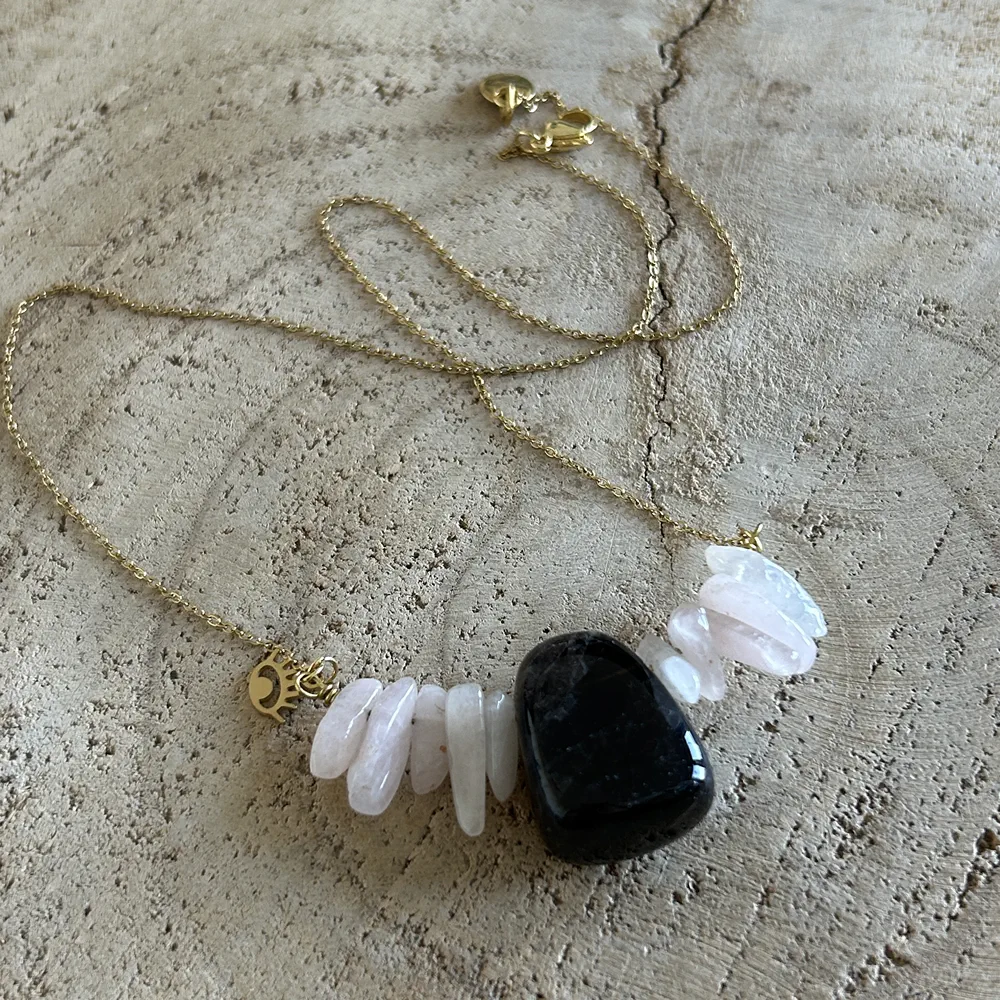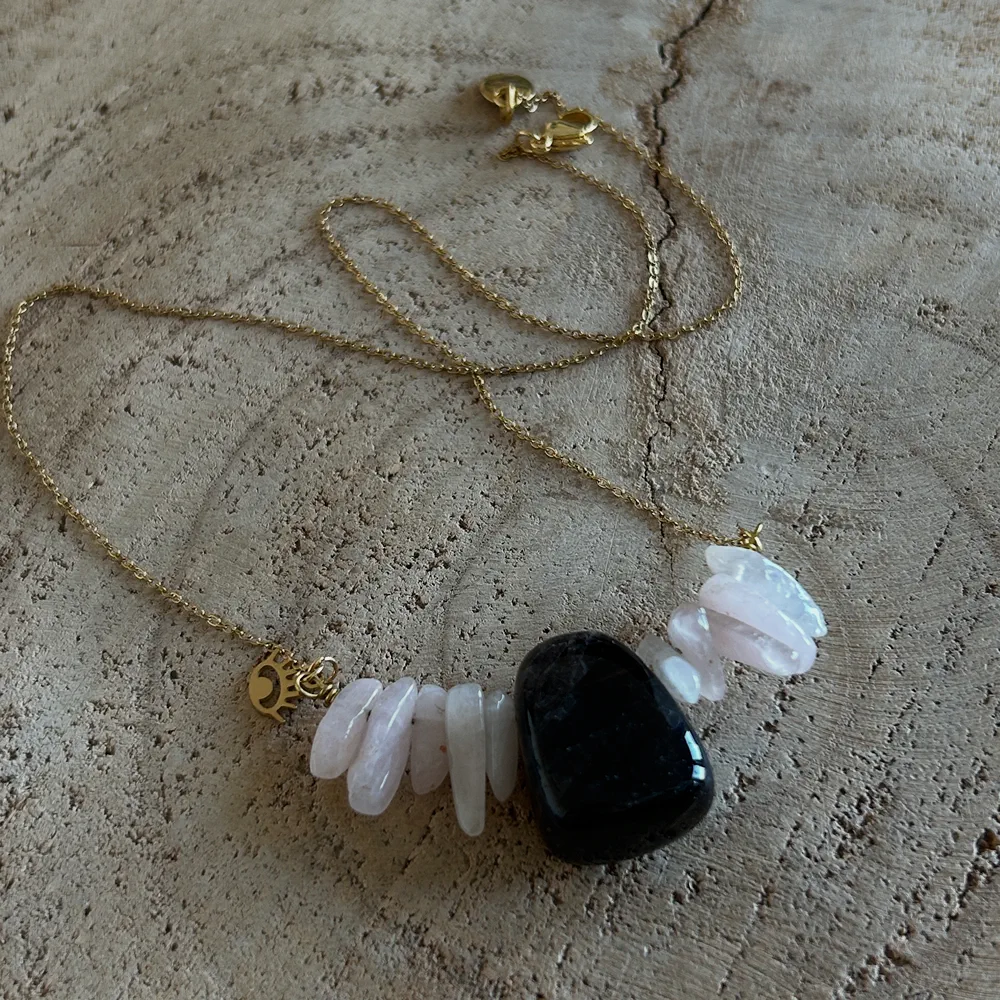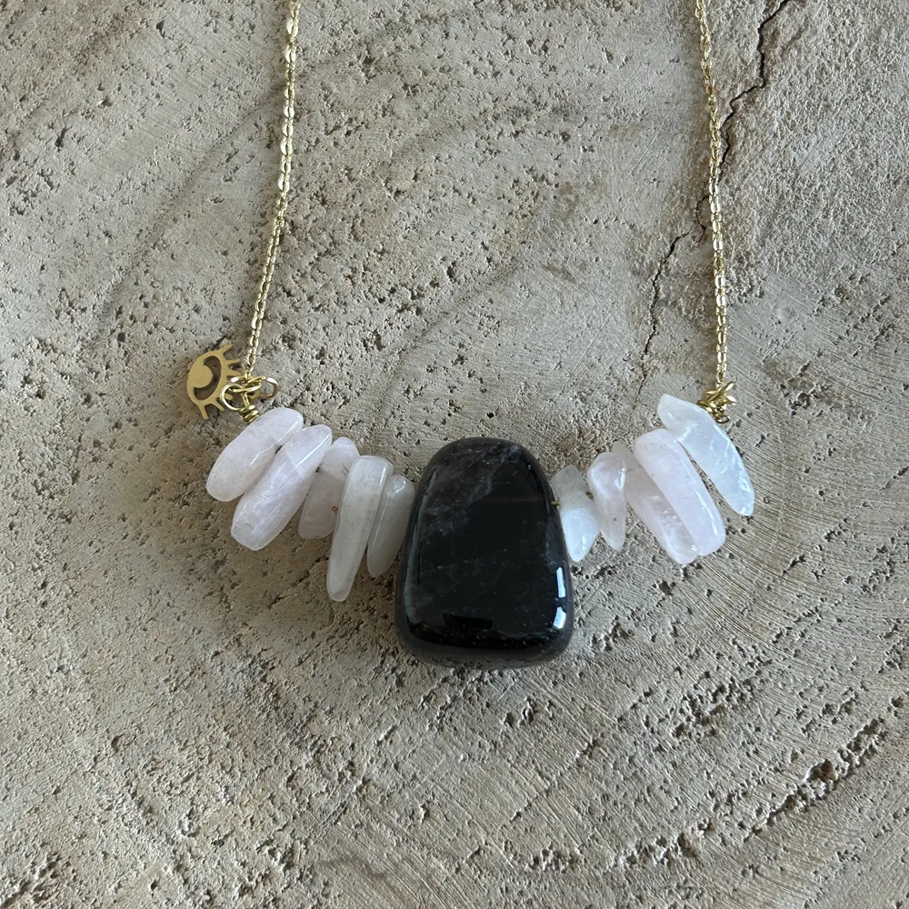 Craquez pour ce collier unique qui mélange les pierres de Quartz Rose et de Quartz Fumé. Parfait pour reconsidérer ses projets de vie, commencer de nouvelles bases et se poser. Dans des energies d’amour et de bienveillance.