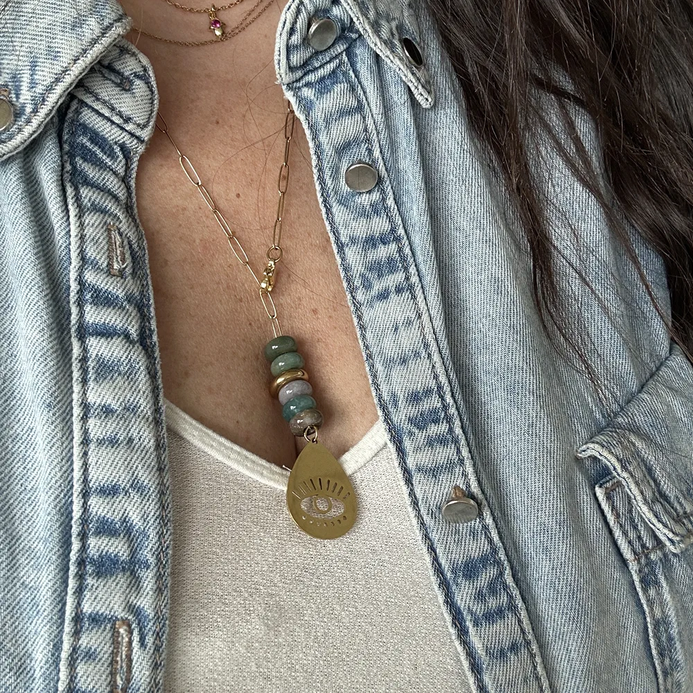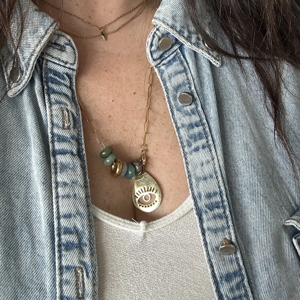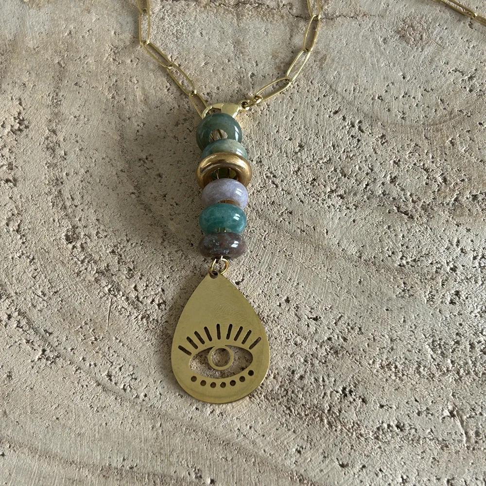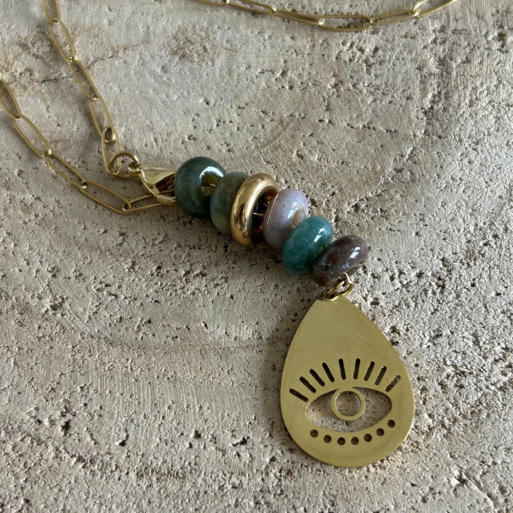 Collier en pierre naturelle Agate indienne, pendentif oeil doré